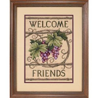 Current status of Welcome Friends. I knew I wouldn't like stitching on the Aida 14, and I definitely do NOT, but by the time I was hating it I just didn't want to start over. It's so stiff that in trying to "sew" a few of the stitches the needle bent. Ive decided to omit the top and bottom sections and just stitch the area including and between the horizontal vines above and below the grapes. I may leave out those horizontal vines as well and end up with an oval or circular design instead.