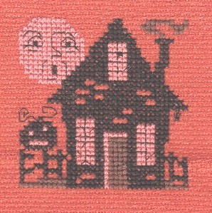 July 2013 Freebie - Used a lighter orange since the charted DMC was the same color as fabric added a bit to the windows, and that's supposed to be a free-stitch "bat" hanging from the roof on the right. Wish the true colors would post. For my DD.