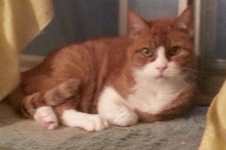 I figured Oscar was one of the local ferals when he showed last summer. I may have seen him even earlier than that, but I'm not for sure it was him. He started coming inside during the fall to eat and use the litter box. (Feral? Litter Box??) I slowly got him used to me, such that when he showed up injured in early January, I simply picked him up and put him in the cat carier - no muss, no fuss. which is when I exclaimed "You've been handled before!" Realizing at that moment he wasn't a feral but likely someone's long-missing pet. To the vet's amazement, he tested negative for FIV, etc, but surprisingly wasn't micro-chipped. He'd been hanging around and/or in my house for at least 6 months. He needed treatment and since locating an owner anytime soon, if ever, wasn't an answerable question, I paid to have him stitched up and while he was under sedation, neutered. Three days later, he dropped the still a bit distant behavior and suddenly began to rub against everything in reach and purring like mad. That abrupt behavior change was really interesting to watch. He'd suddenly decided I was his and this was home. I did look for ads re missing big gray-blue cats for a while, but he'd been around so long by then if there was a missing notice, I couldn't find one. He's smart enough that if he was from around here he'd have long since found his way home. When the stitches were removed, I had him microchipped with my info. I originally thought he might be a Russian Blue since he has that unmistakeable blue grey coloring, but wrong color eyes, and he was already too big. I started researching other big blue cats with gold eyes and wooly fur and discovered and now and absolutely convinced he's a CHARTREUX. Mostly if not pure bred. How a Breed still relatively uncommon in America ended up a stray on my windowsill I'll never know. In January he weighed 14.1 pounds and the vet said he was a bit too thin. A month later he'd already gained 2 pounds and in May he weighed 18.1 pounds. The vet said he'd be better off at 16 pounds. He's now up to 19.1 pounds. GOOD GRIEF!! Since he's not outside 24/7 running it off, Oscar definitely needs to go on a diet!