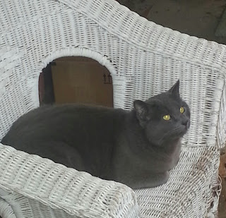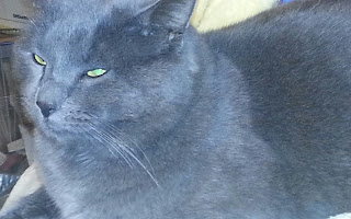 Again, I am convinced he's a Chartreux. His eyes are gold, He's got the distinctive wooly fur and at 16 to 18 pounds is the right size. And then there's the quiet trilly meow also particular to the breed. However, when he REALLY wants out or attention, he can get quite loud and insistent. If he's just announcing, it's the trills. But mostly he WANTS OUT. At times he runs to every window and tries to find a way. I've discovered that's usually linked to an urgent need to go potty, despite the fact he and Henna share 2 litter boxes. A couple of times he's left me a present - I guess because when he couldn't get out he didn't have time to make it back to the litter box. I am NOT happy about that! To get out he jumps in and out of the windows over my bed (once on my shoulder - it's like getting hit by a falling bowling ball, and for a long time bit my toes and grabbed my leg with all 4 paws. That was until he bit my heel while I was asleep and I inadvertently kicked him with said bitten heel right in the face. I apologized profusely but still feel awful about having done so. He did get the message and hasn't bit the back of my heel since. And when I say NO or make an irritating squawk he does quit the nipping and capturing. He also knows the word "stay" and no longer ALWAYS tries to get out the front door when I leave. Keeping him inside when I get home is another matter. His present favorite game is to flop on the floor and TRY to attack my feet as I step over him (after a belly rub, of course), just not as robustly as before. His favorite sleep position is flat on his back legs fully splayed. Silly, beautiful cat.